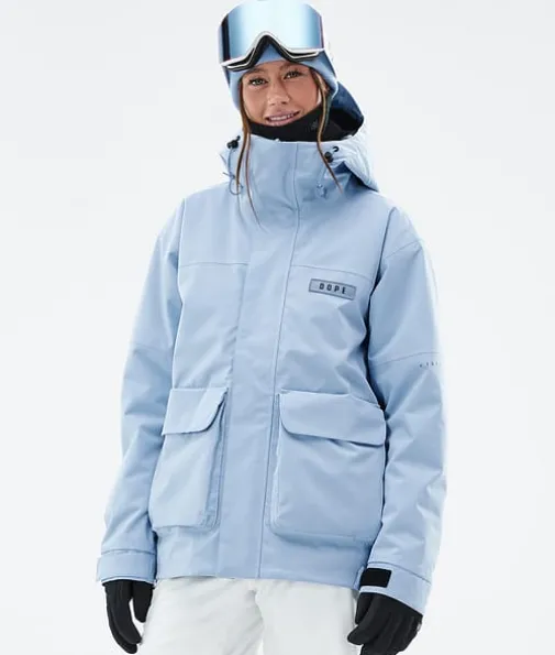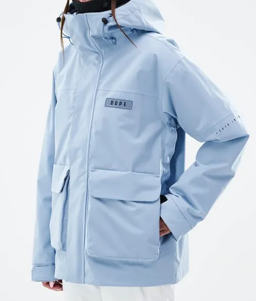 Acme W Skijakke Dame Light Blue|Møt jakken Dope Acme! Acme har strømlinjeformet design, clean, knappeløs front og to store sidelommer, som til sammen er en blanding av funksjonalitet og stil. Den har retro passform som kan brukes som den er, eller strammet med trekksnoren nederst for en kortere, mer firkantet stil. Materialet med 4-veis stretch gir maksimal bevegelsesfrihet, og Acme leverer på alle de viktigste funksjonene du trenger, uten å bli klumpete. Denne jakken er ekstremt allsidig og lett, og er perfekt for en lang sesong på fjellet – dette kan fort bli førstevalget for nye vintereventyr.