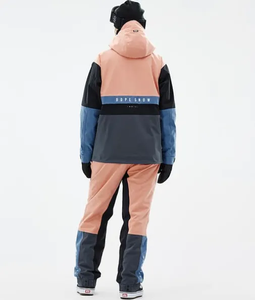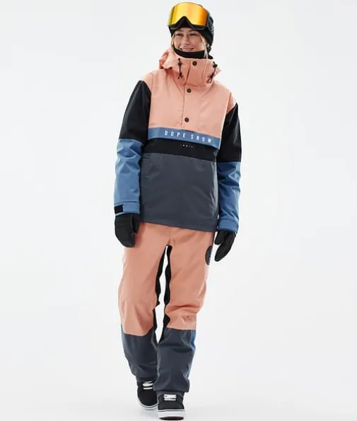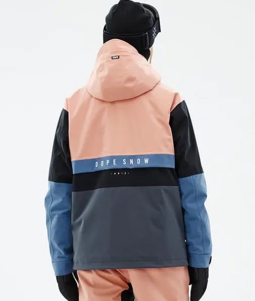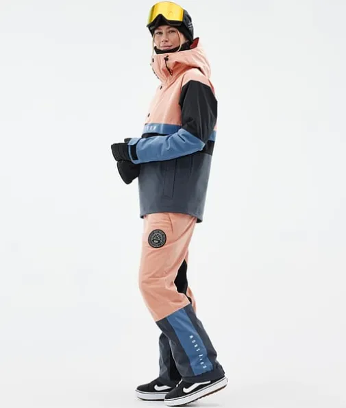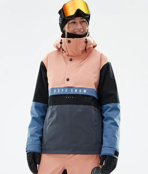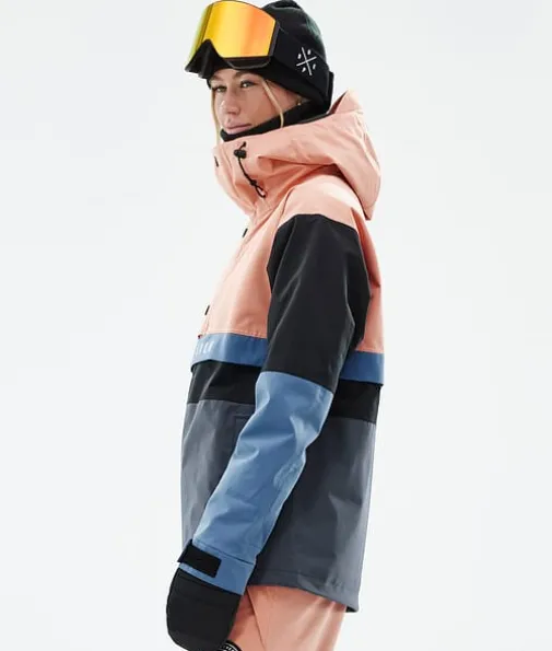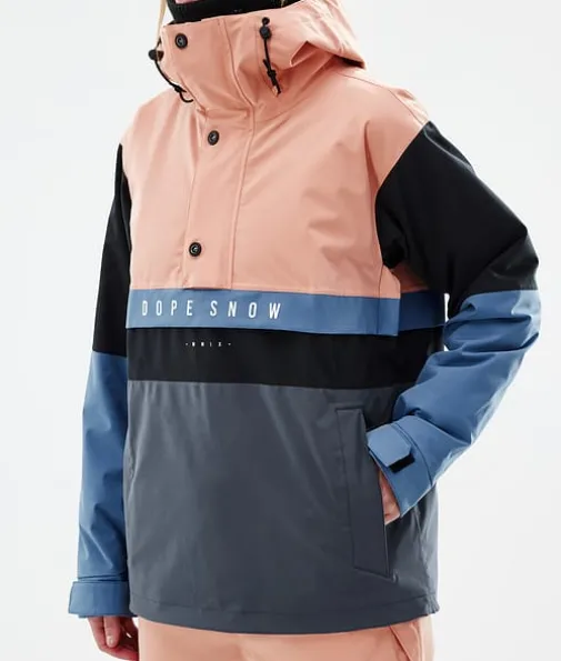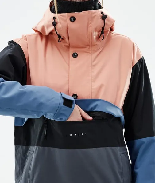 Legacy Track W Snowboardjakke Dame Faded Peach/Blue Steel/Black/Metal Blue|Legacy kaster blikket tilbake til 90-tallet og kombinerer en løs anorakkpassform med tekniske kvaliteter fra avanserte skijakker. Den er laget med tanke på rolige økter og er lett å kaste på eller av når det passer. Når du ikke trenger fancy og klumpete skijakkefunksjoner som glidelåser er Legacy jakken for deg. Nå som den også har det utrolig slitesterke skallet med fireveis stretch, kan du være trygg på at Legacy gjør inntrykk der du ferdes.