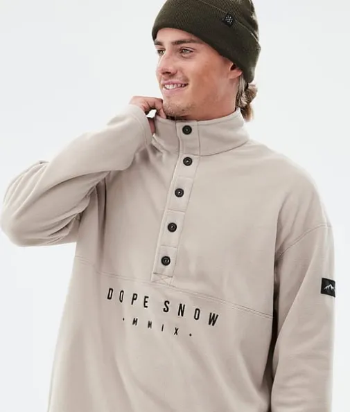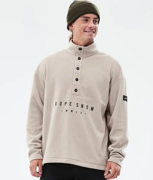 Comfy Fleecegenser Herre Sand/Black|Med Comfy-genseren er du garantert komfort, takket være en fleecekonstruksjon i 250 g/m2 100 % resirkulert polyester som holder på varmen i all slags vær. Med en stilig design med knapper og høy hals er denne fleeceen ideell for å kose seg i bakkene eller slappe av hjemme. Dette supermyke materialet er behagelig mot huden, og de elastiske endelinningene sikrer god passform og varme. Forskjøvede skuldersømmer reduserer friksjon mens du kjører, og kule Dope-detaljer gir ekstra stilpoeng uansett hvor du skal, noe som gjør Comfy til din nye favoritt denne sesongen.